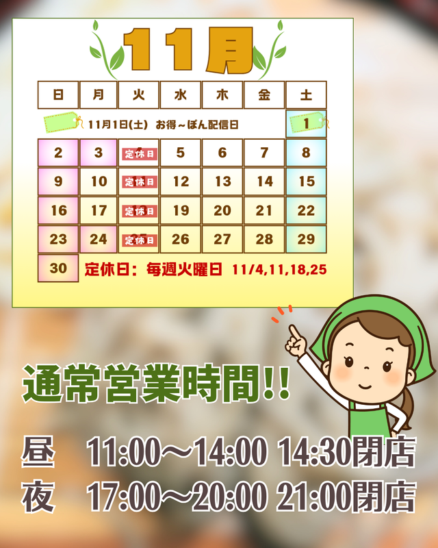 昼営業 11:00~14:30(入店14:00まで)夜営業 17:00~21:00(入店20:00まで)